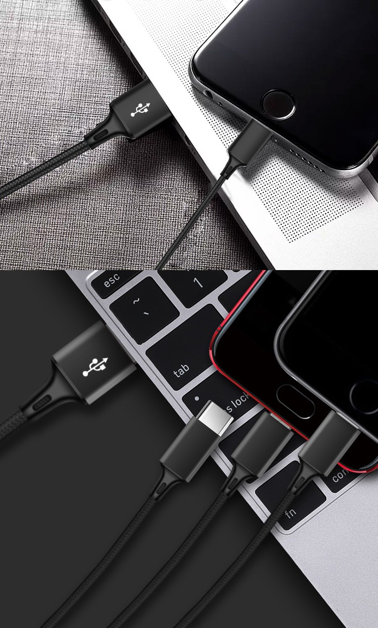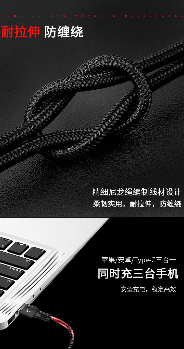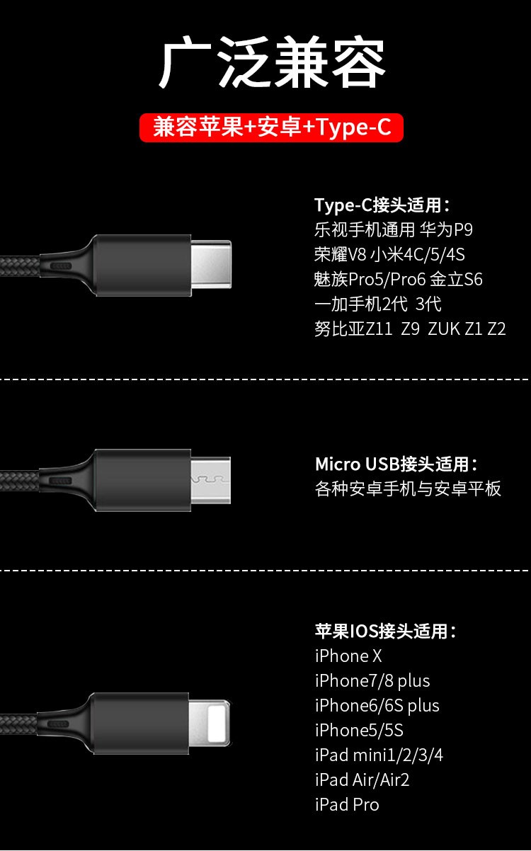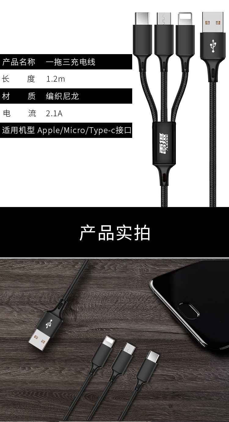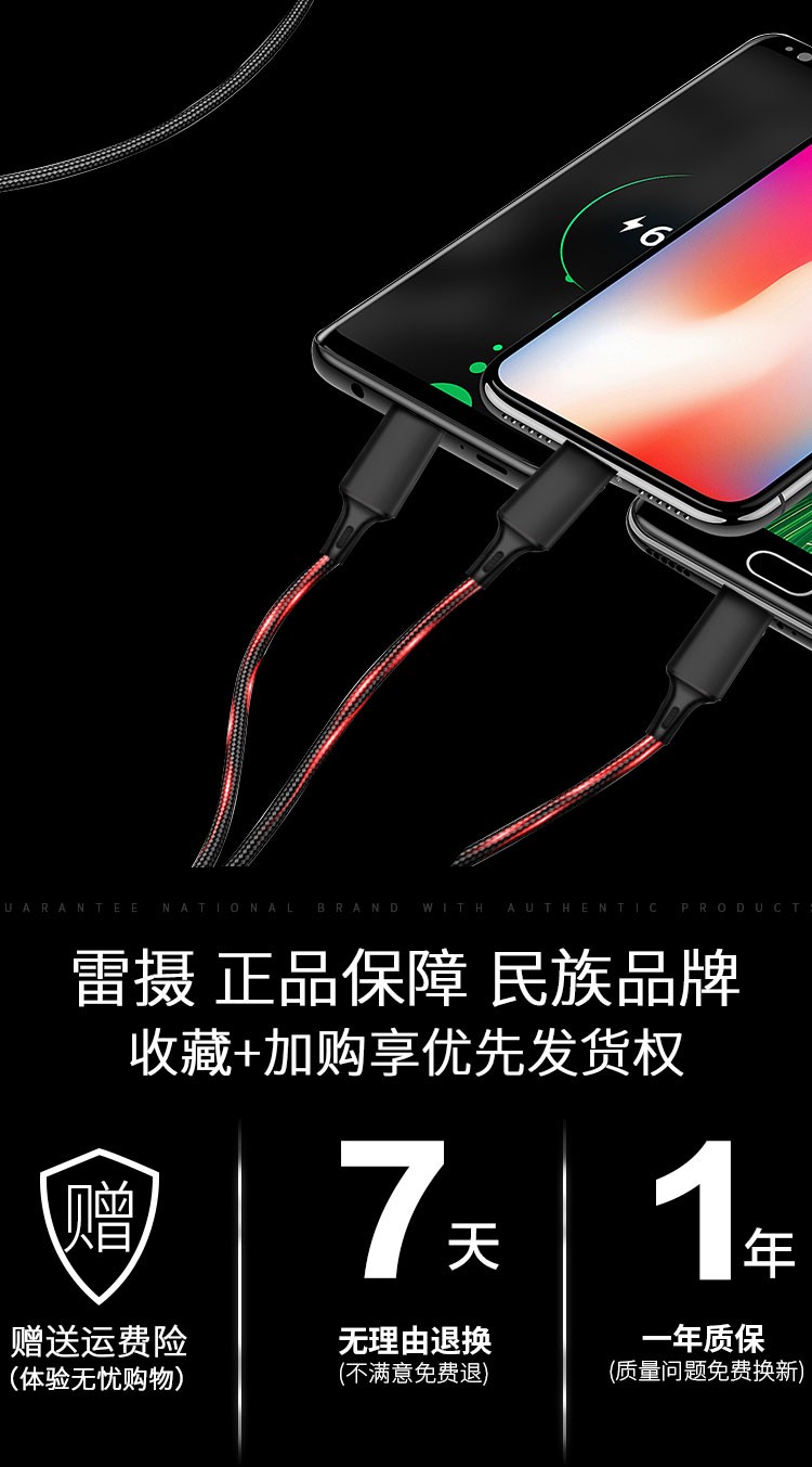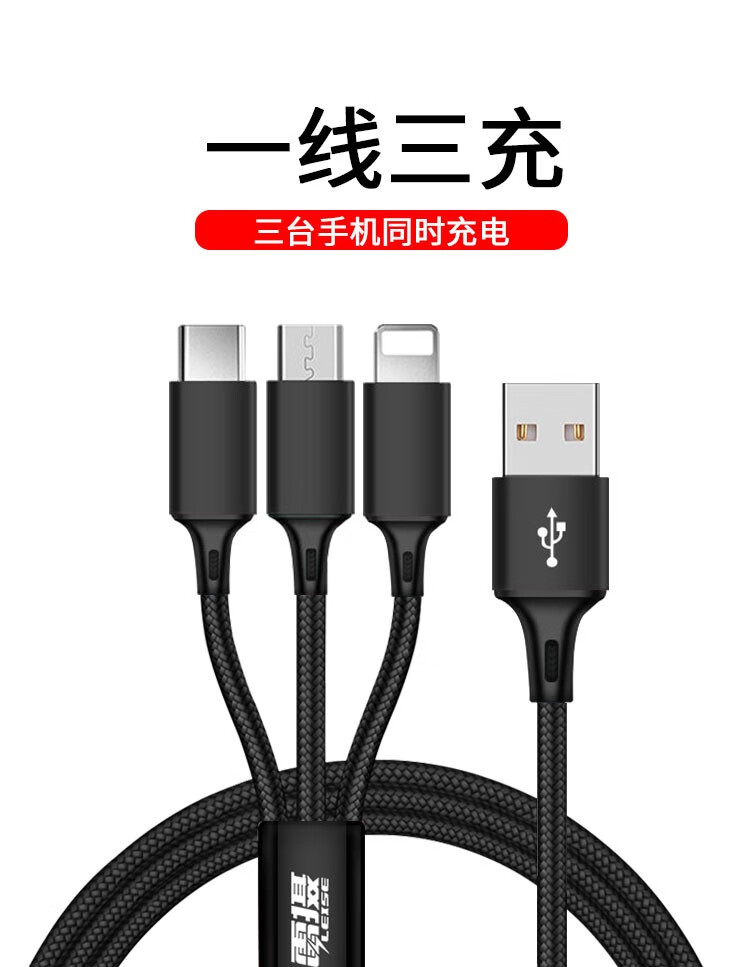 雷摄 LEISE LS-301 一拖三充电线 苹果/Type-c/安卓数据线 2.1A 车载手机快充电源线 条 黑色