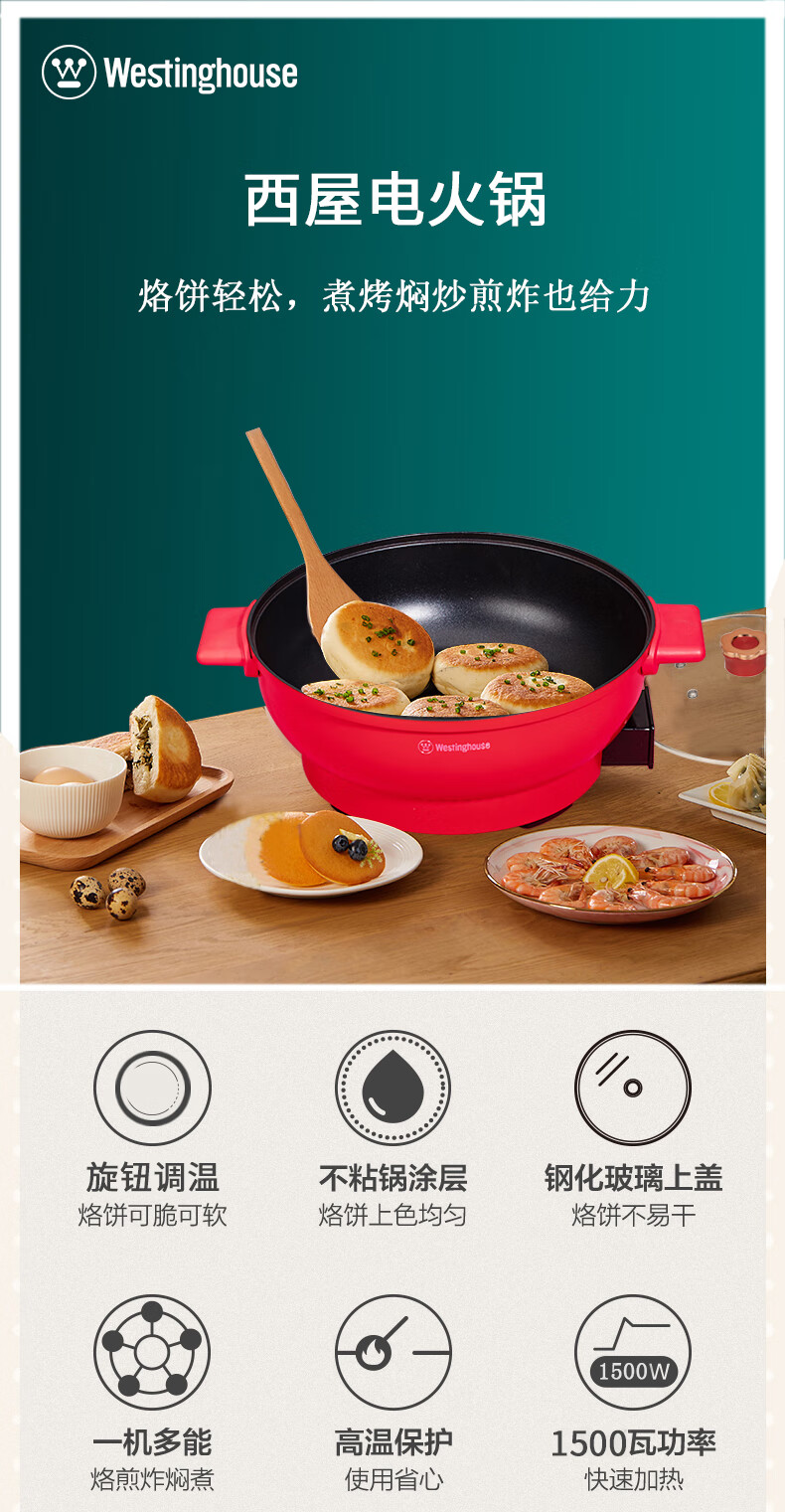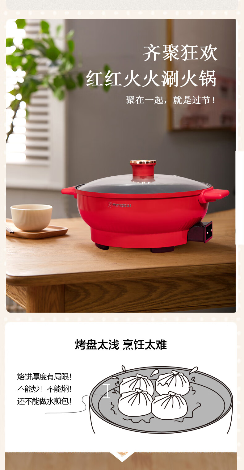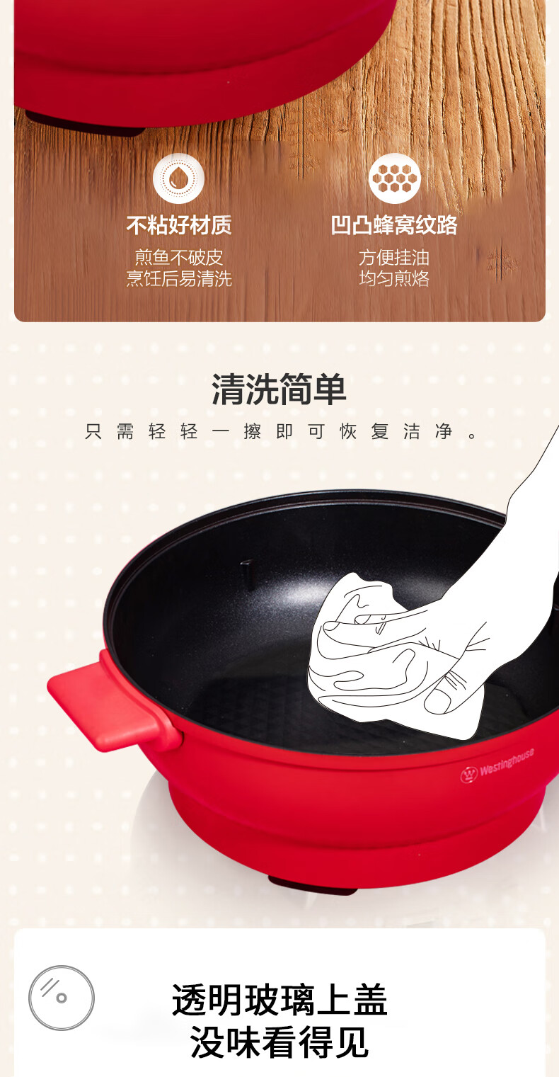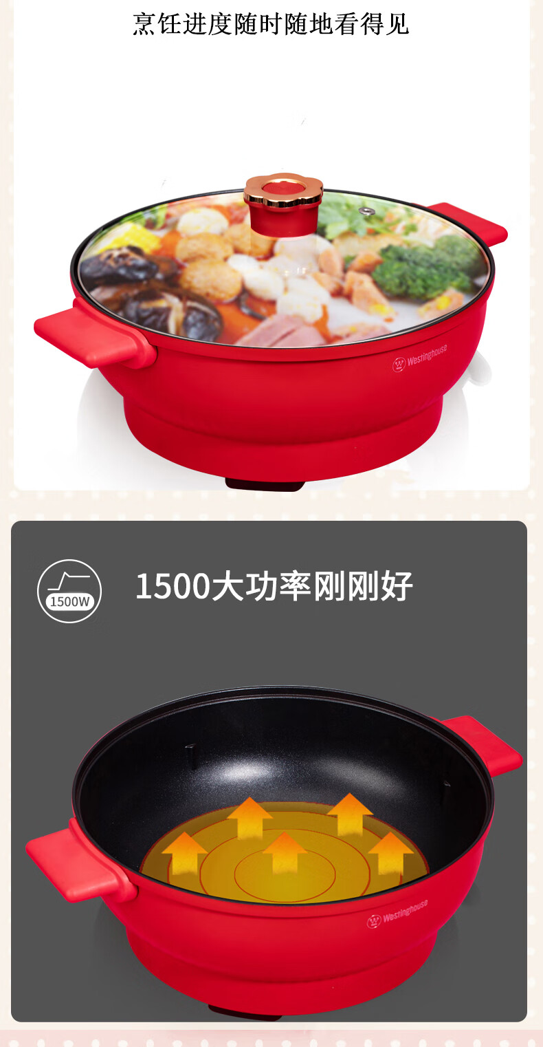 西屋(Westinghouse)多功能电火锅WHG-1501B 5L容量 不粘涂层 1500W (单位:台) 红色