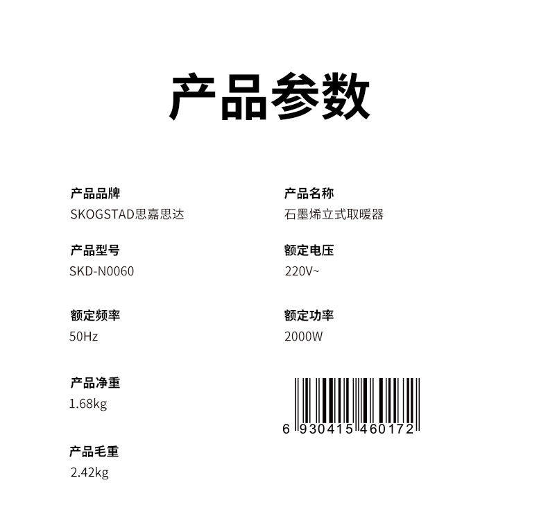 思嘉思达(SKOGSTAD)石墨烯立式取暖器SKD-N0060 白色
