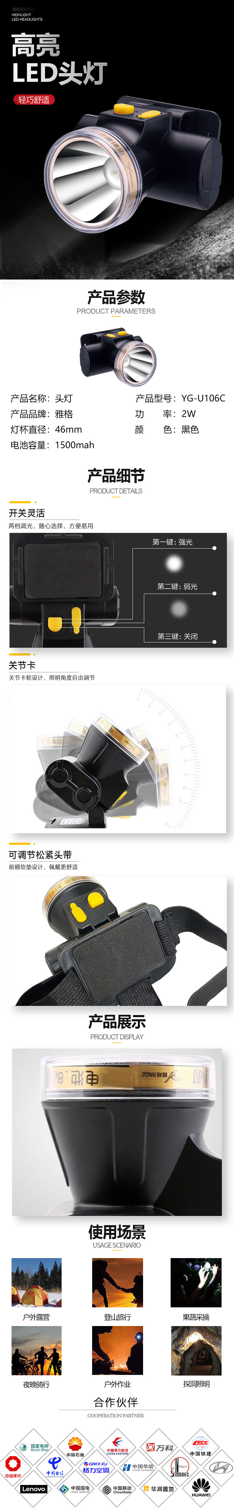 移动灯具 雅格 LED头灯 2W 黑色 双档调光 充电式锂电户外防水强光头灯 远射探照矿灯 YG-U106C 黑色