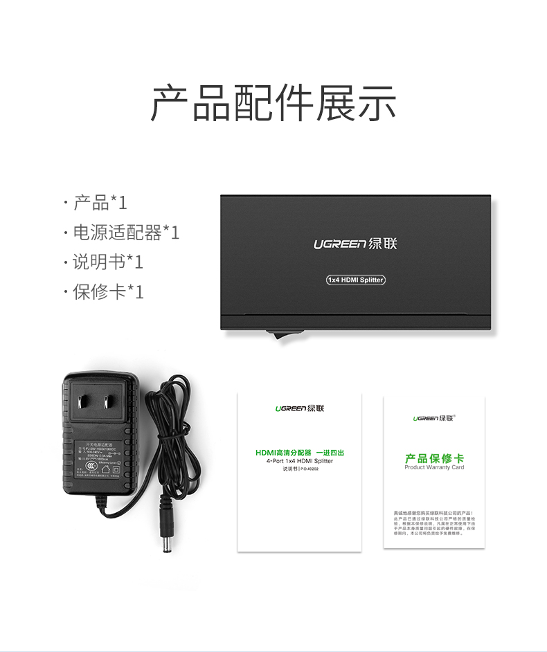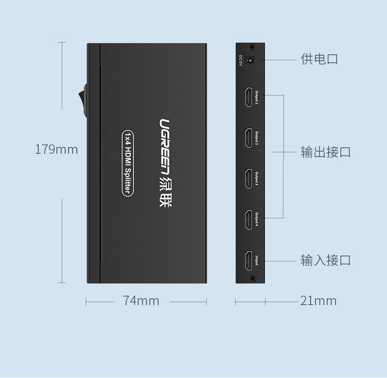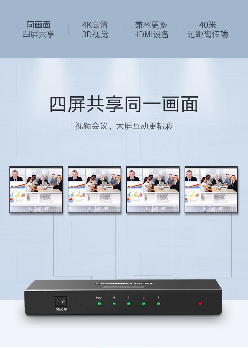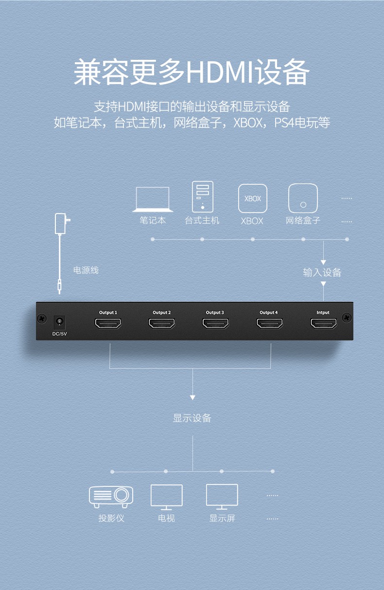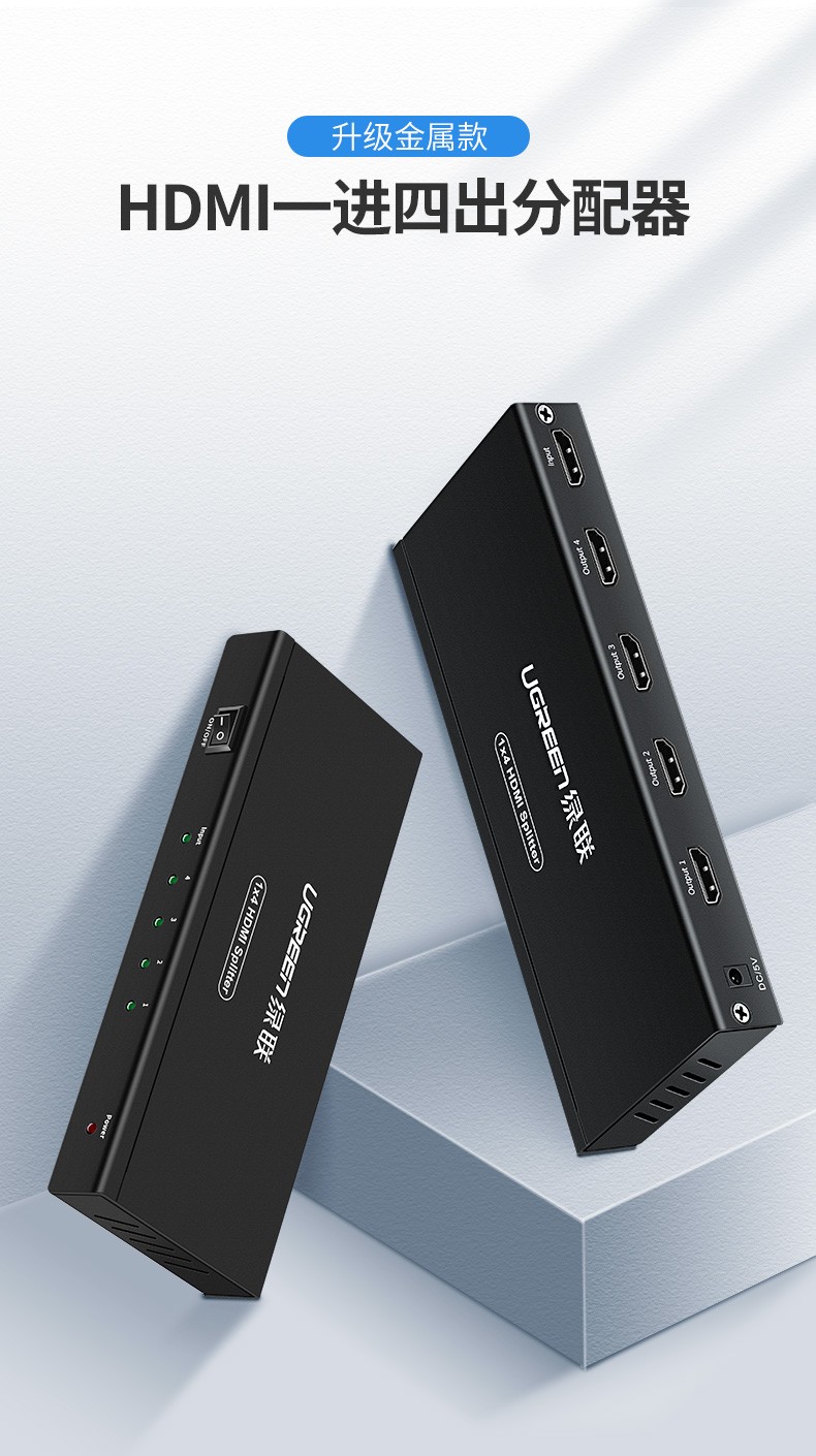 绿联 40202 HDMI分配器 一进四出4K数字高清视频分屏同屏器 黑色