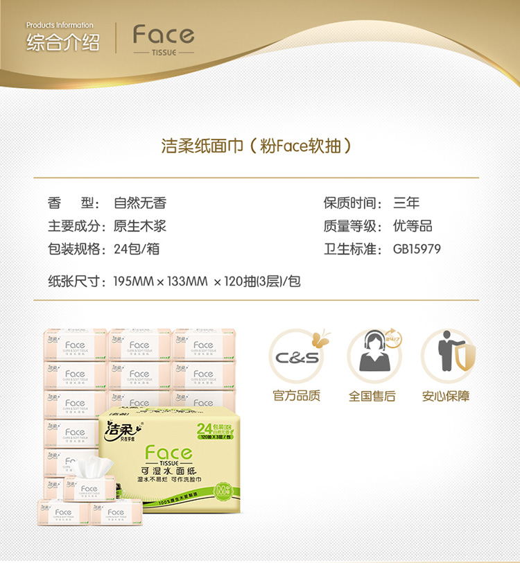 洁柔粉Face软抽纸120抽3层24包纸面巾整箱PR078-24E 白色
