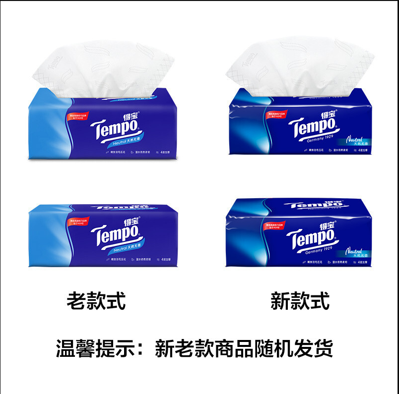 得宝(Tempo) 天然无香抽纸巾18包4层90抽T2275-18E新旧包装随机发 宝石蓝