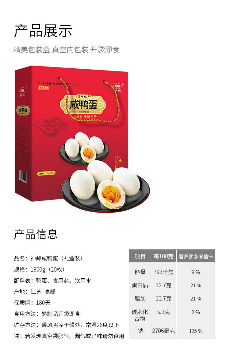 神邮 高邮咸鸭蛋 熟20枚*65g 礼盒装