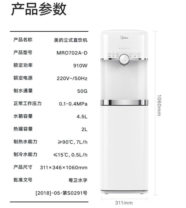美的(Midea)MRO702A-D 商务净水机 极地白 JSWJ-0-DSB 冷热温三水 电子冰胆制冷 小型直饮机P10 50G 工程定制机 极地白