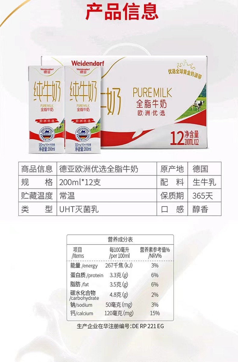 德亚 全脂牛奶 礼盒 200ml*12(新老包装随机发货)(进口牛奶日期不过半) 200ml*12