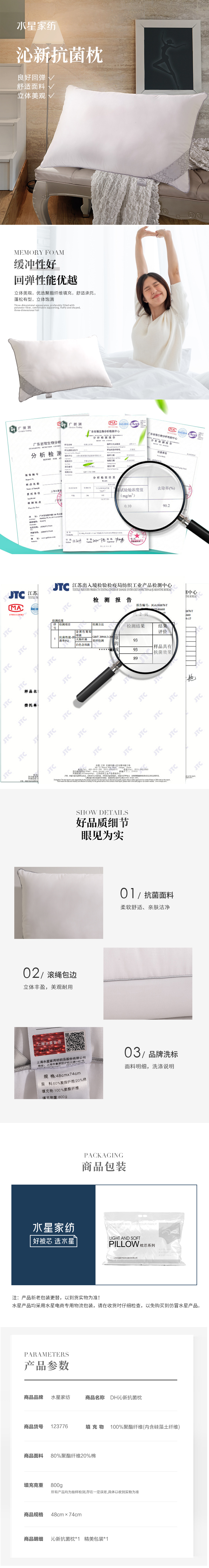水星家纺 DH沁新抗菌枕 一个装 灰色