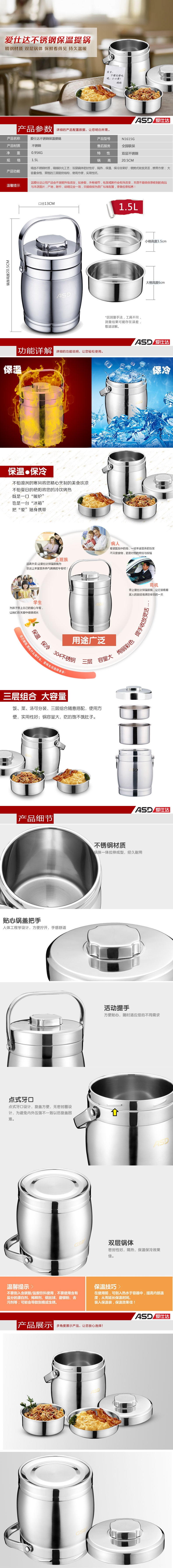 爱仕达不锈钢鼓形保温提锅N1615G(单位:个) 不锈钢色