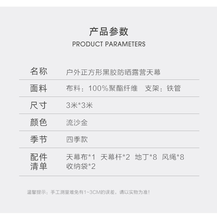TFO户外正方形黑胶防晒露营天幕3*3m2502208B31 流沙金
