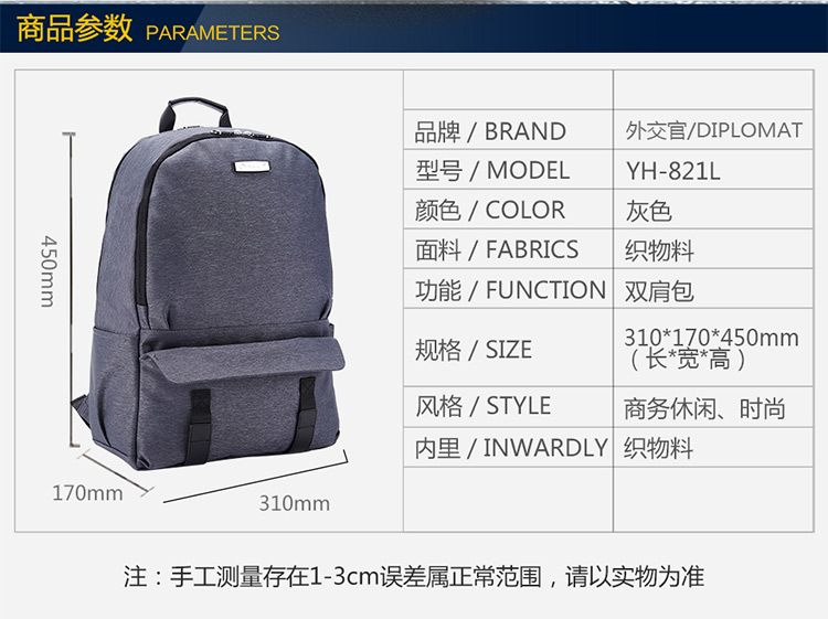 Diplomat外交官商务休闲双肩背包YH-821L (单位:个) 灰色