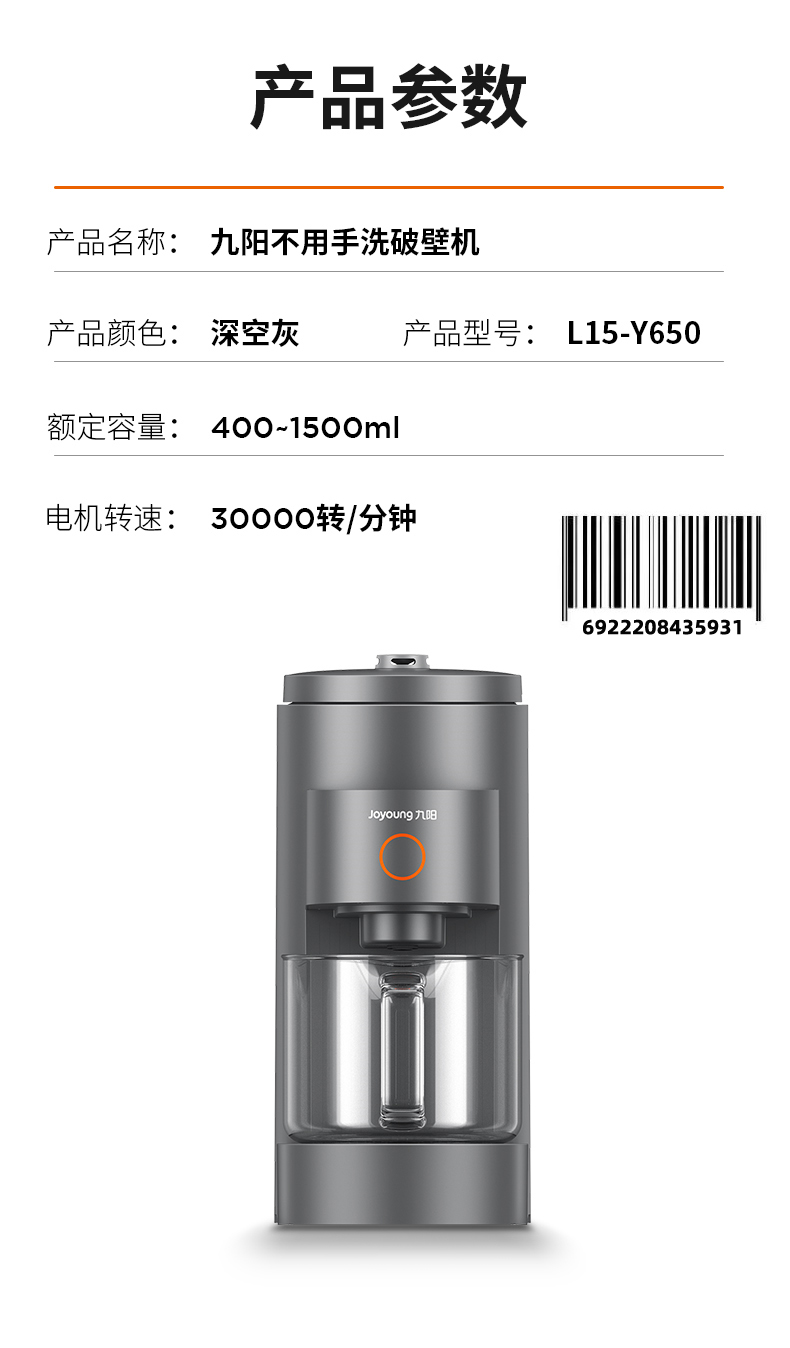 九阳(Joyoung) L15-Y650不用手洗破壁机低音1.5L全自动料理机(黑色) 深空灰