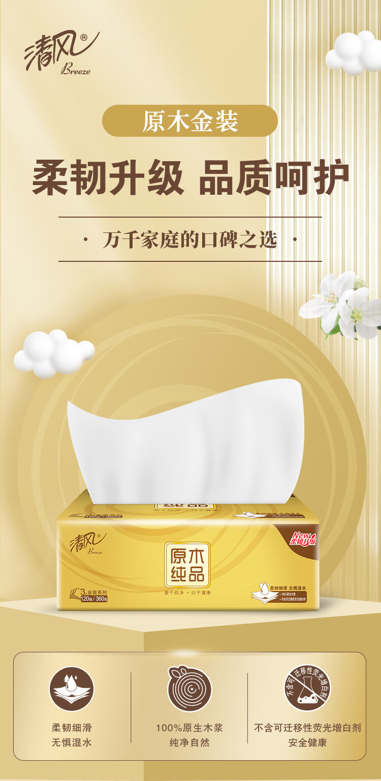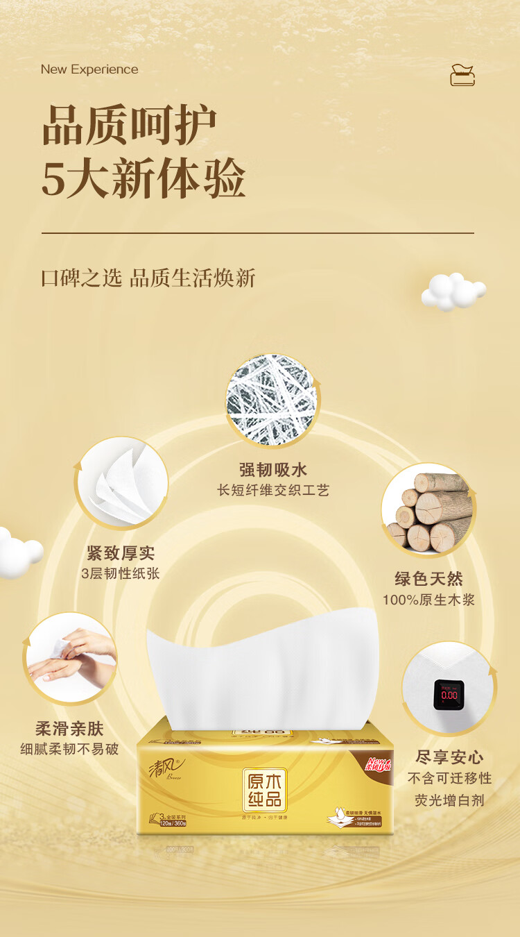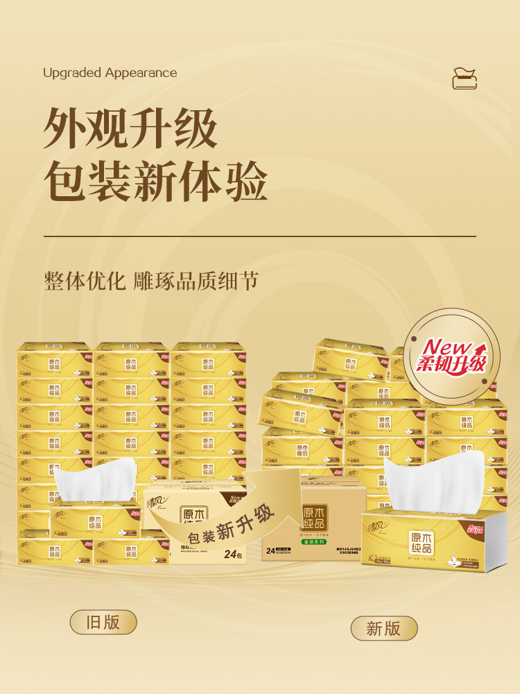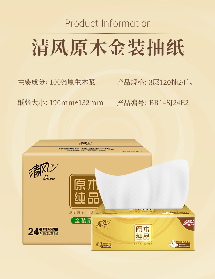 清风原木金装3层120抽24包整箱装DXTQF023 金色