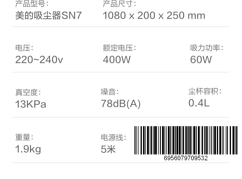 美的(Midea)吸尘器有线除尘器 400W功率 SN7(单位:台) 白色
