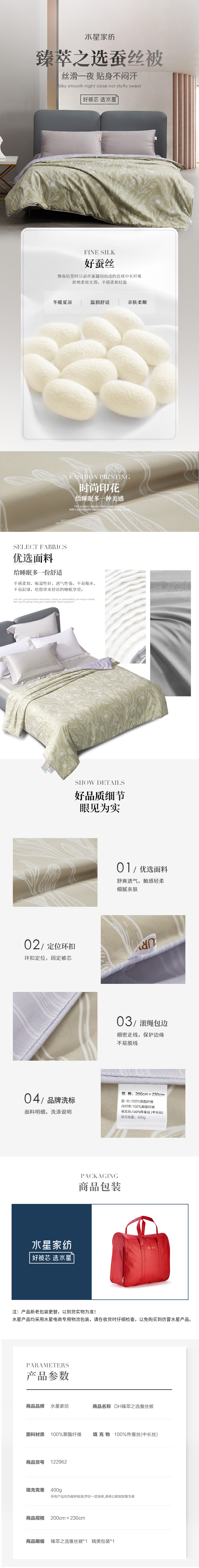 水星家纺200cm×230cm被子|DH臻萃之选蚕丝被-122962/条 绿色