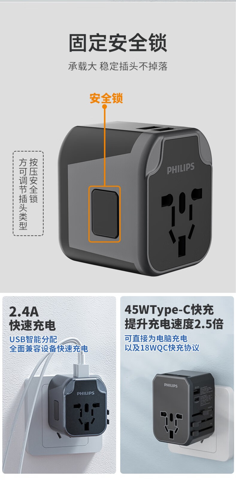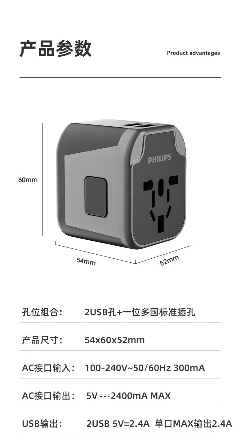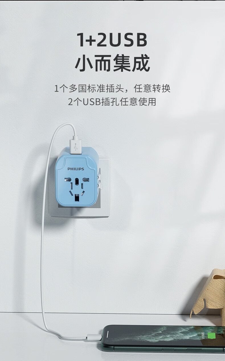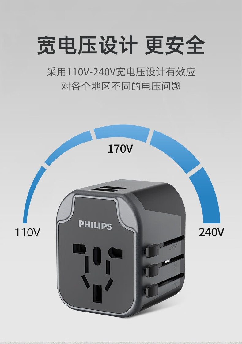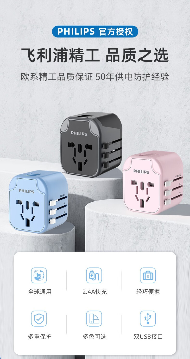 飞利浦(PHILIPS)旅行转换插头/电源转换器插座/英标欧标美标澳标日本适用/2USB充电 SPS1001A 黑色