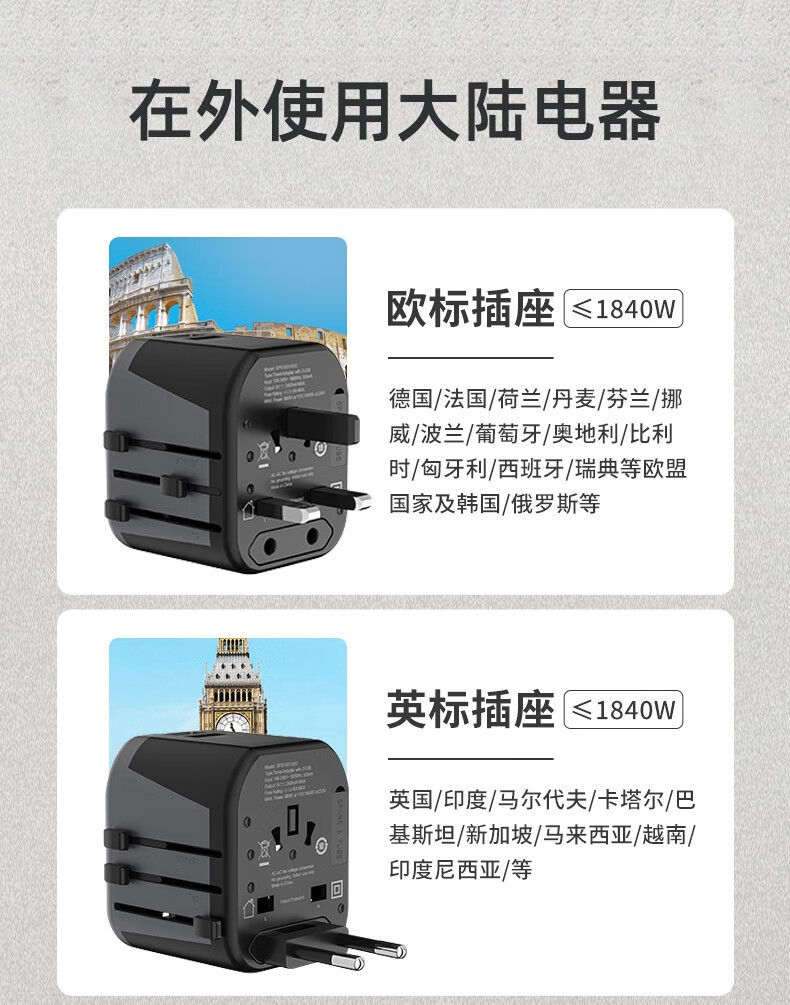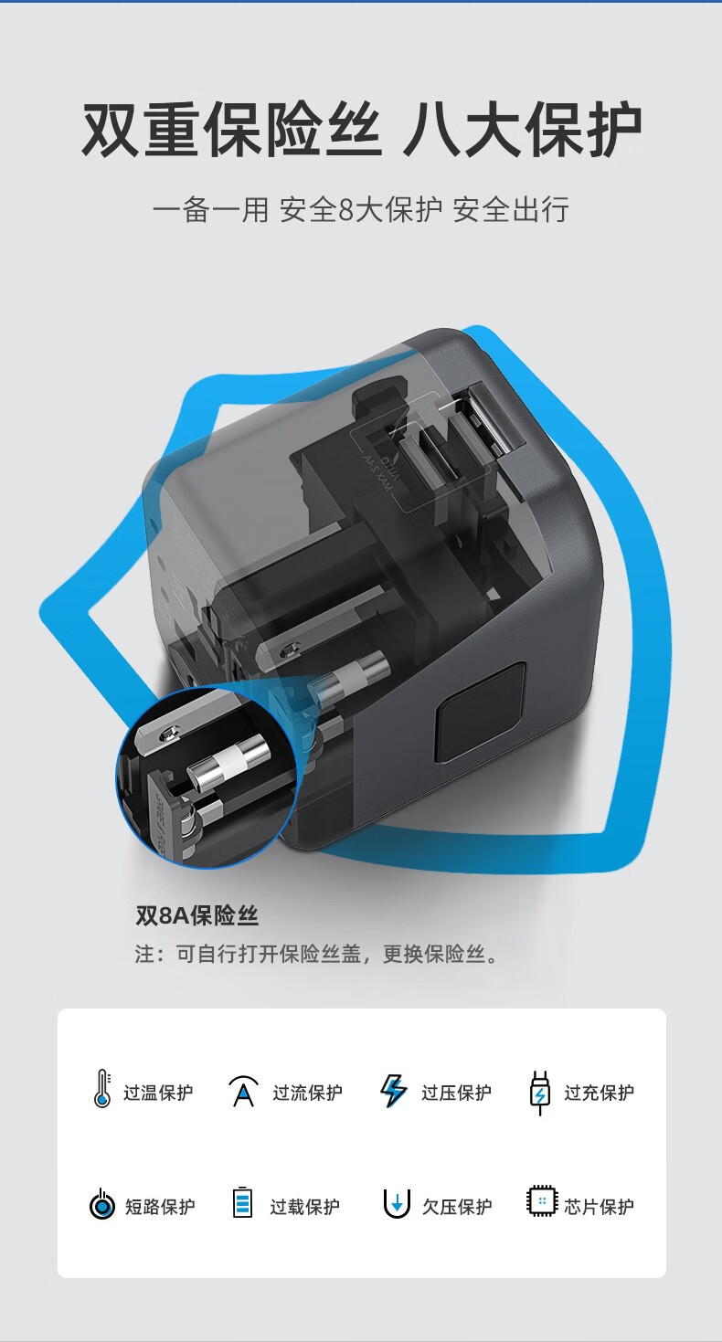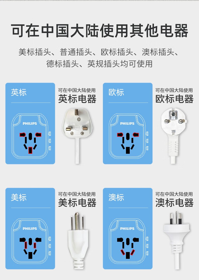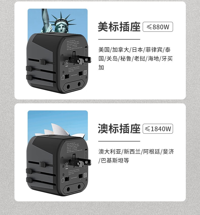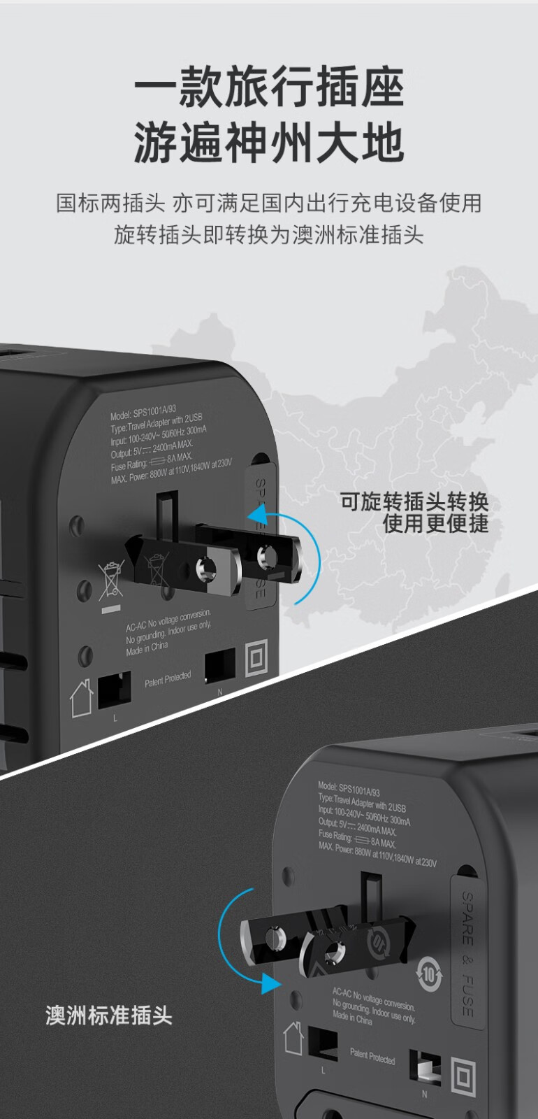 飞利浦(PHILIPS)旅行转换插头/电源转换器插座/英标欧标美标澳标日本适用/2USB充电 SPS1001A 黑色