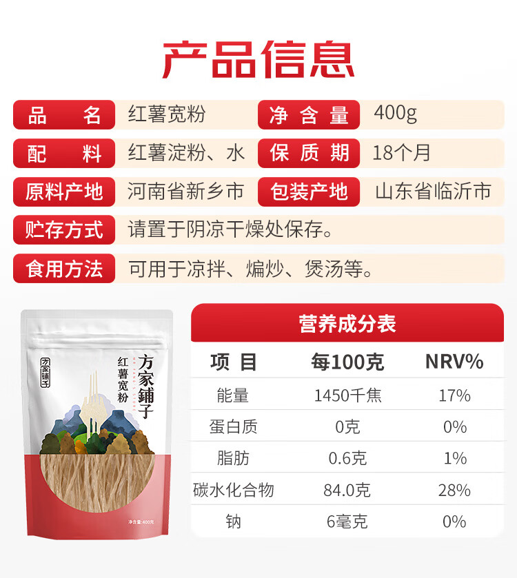 方家铺子纯红薯宽粉400g 火锅食材配料 地瓜粉 红薯粉条粉丝始于1906
