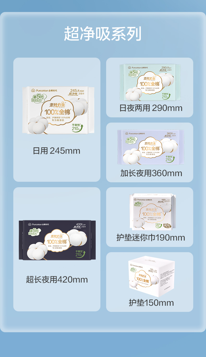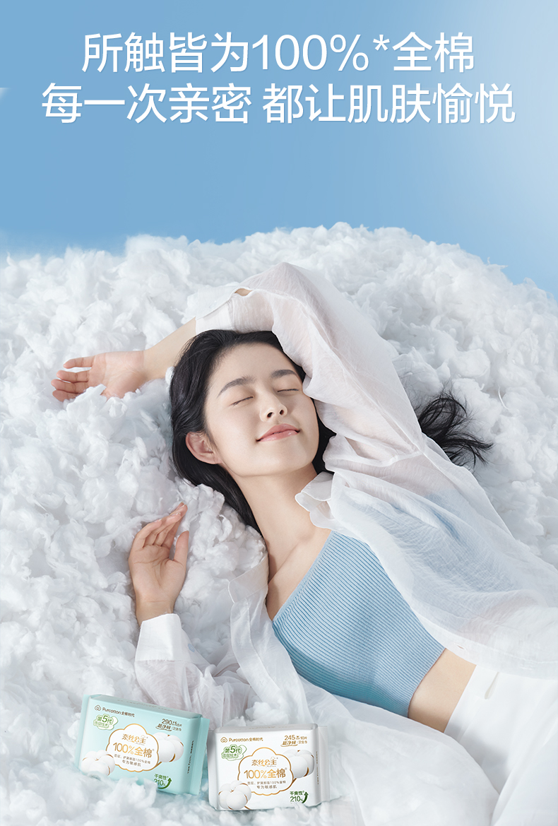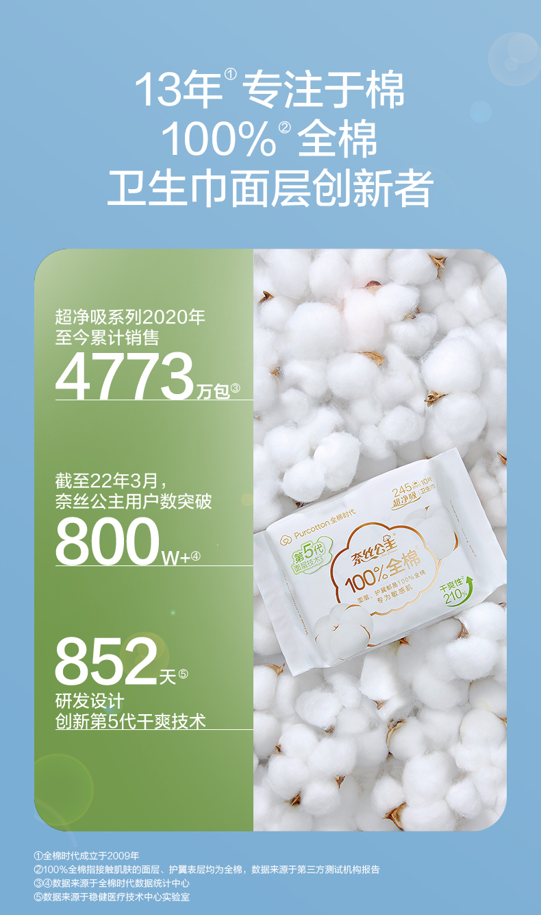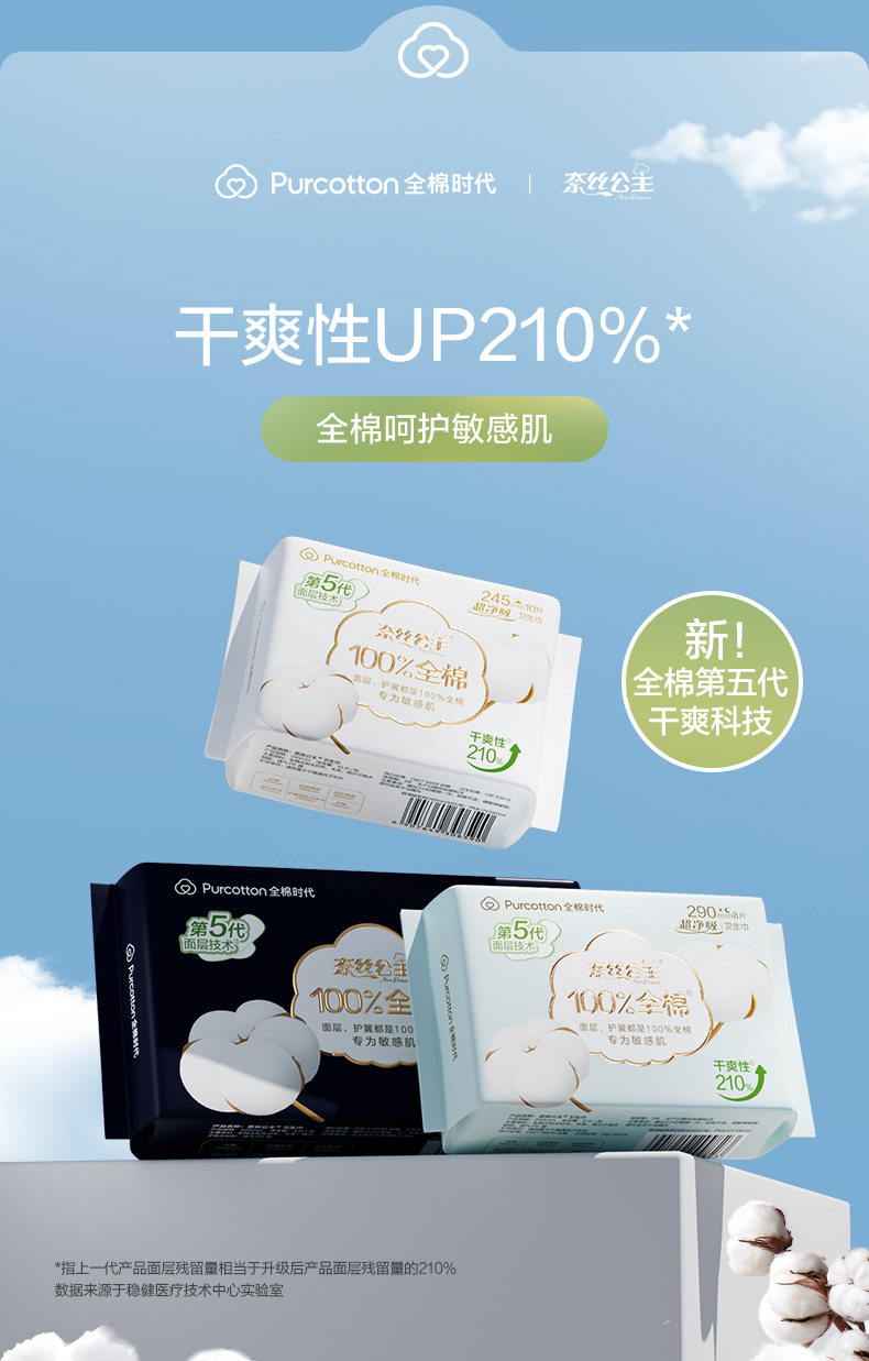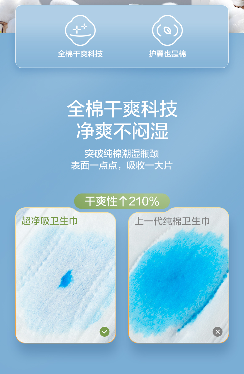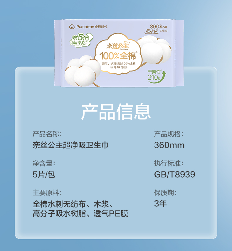 全棉时代奈丝公主超净吸系列亲肤超薄加长夜用360MM 5片/袋 天蓝色
